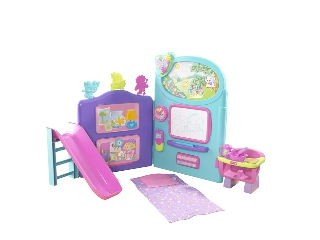 The Play All Day Activity Center is a fun-filled interactive playset with stand-alone play, but there are even more surprises when you play with the Little Mommy Play All Day Toddler doll, sold separately. The center includes sing-a-long A-B-C's, count-a-long 1-2-3's, a phone that really rings and an erase board for drawing pictures. There are also lots of realistic accessories inspired by Fisher-Price. There's a potty that flushes, retractable toilet paper and soap, and places for naptime, snack time and play time, too! Let your Play All Day Toddler Doll (sold separately) intereact with the Activity Center, and she'll react with special sounds and adorable arm movements. Requires 2 "AAA" batteries, not included. Measures 42" wide.