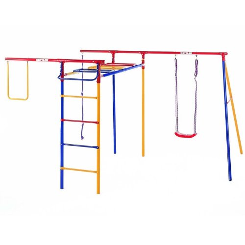 Turn your backyard into a schoolyard with this fun, diverse Kettler Trimmstation Swing Set. It comes with horizontal and vertical ladders, climbing rope, and a board swing. Pull-up bars and swing are also included and prove great for different exercises. Made with a fade- and rust-resistant powder coat finish to ensure years of use, it can also be used with the Baby Swing Seat and Slide attachment (sold separately). This swing set measures 78 x 136 x 140 inches (H x W x L) and weighs130 pounds. The recommended frame capacity is 300 pounds and the recommended age for use is 3 years and up.