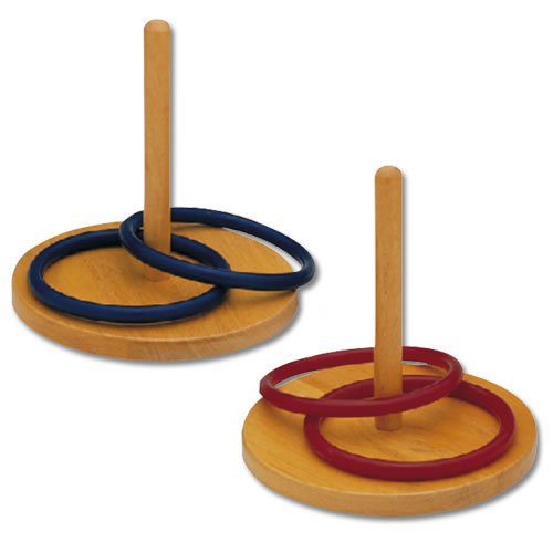 The US Games Wooden Ring Toss Activity is constructed of attractive, varnished wood. This popular variation of horseshoes contains 2 Blue and 2 Red plastic rings and 2 bases.